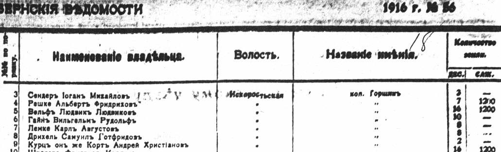 The Russians sent the Germans of Liski into exile in July 1915, and seized their possessions. The Wolhynien Area News -- a Russian-language newspaper published in Zhitomir, and the major source of information for this part of Ukraine -- published this list of the owners of seized land.